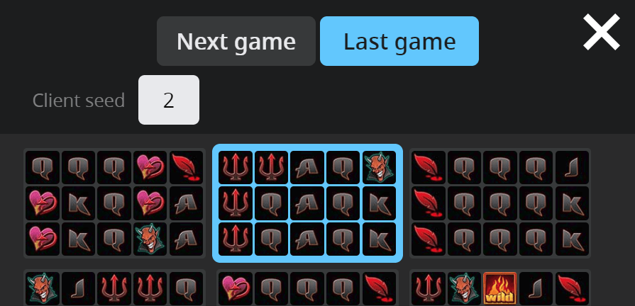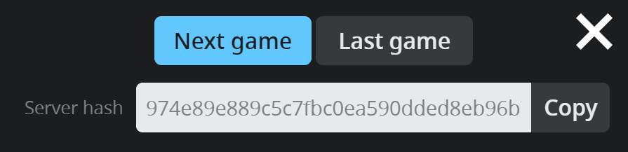 When you finish the game, you can check the fairness of the game in the game menu under Provably Fair’s Last game tab. You will be presented the original server seed, server hash (the hashed server seed) and the client seed.